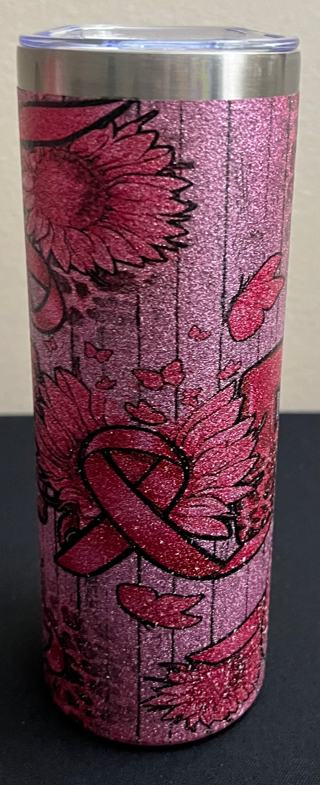 Shine with strength and beauty wherever you go with this stunning 20‑ounce pink glitter stainless steel tumbler. Designed to inspire and uplift, it features vibrant pink sunflowers, delicate butterflies, and the meaningful pink Breast Cancer Awareness ribbon—a heartfelt tribute to courage, hope, and resilience. The sparkling finish adds a touch of joy and confidence to every sip.
