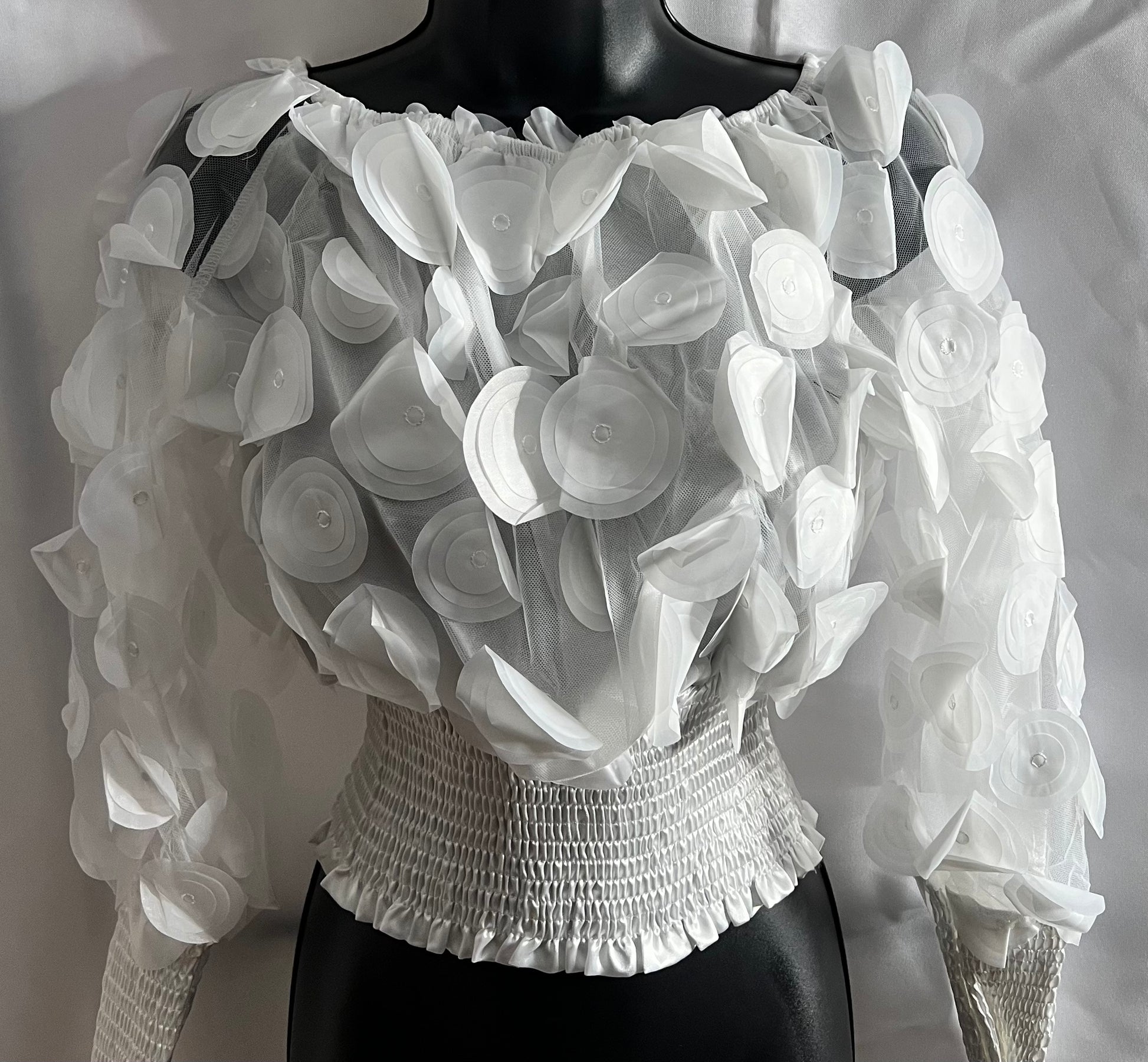 Sheer, elastic waist top with circle appliques. Top can be worn on or off the shoulders