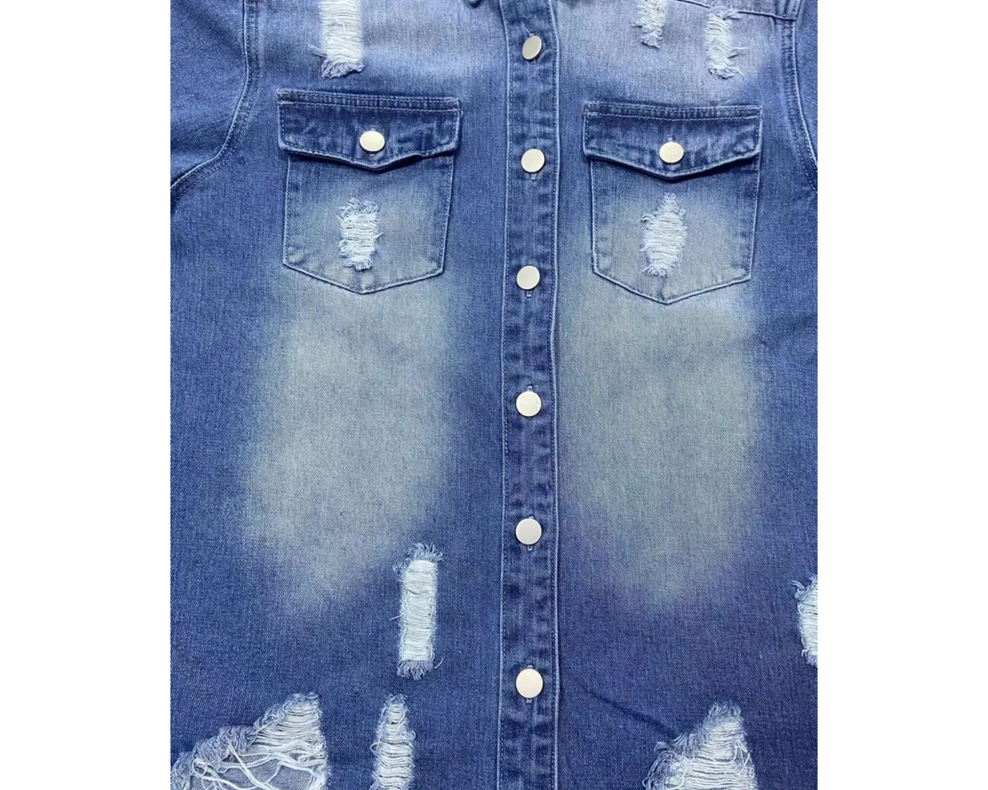 Long Sleeve, distressed denim shacket with front snap closure and sleeve.