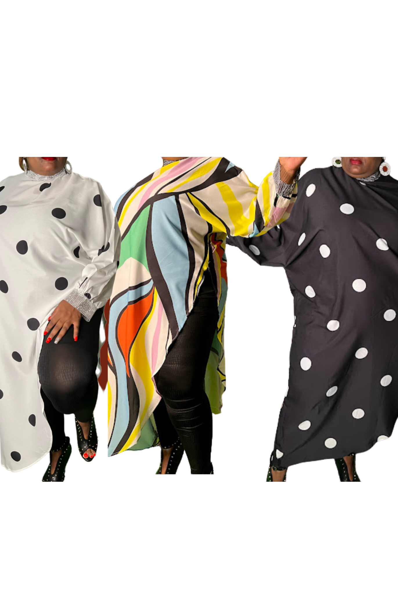 Asymmetrical cut, semi-sheer, long sleeve, loose fitting blouse with rhinestone embellished wrist and neck cuffs. Can be worn as a blouse or dress.