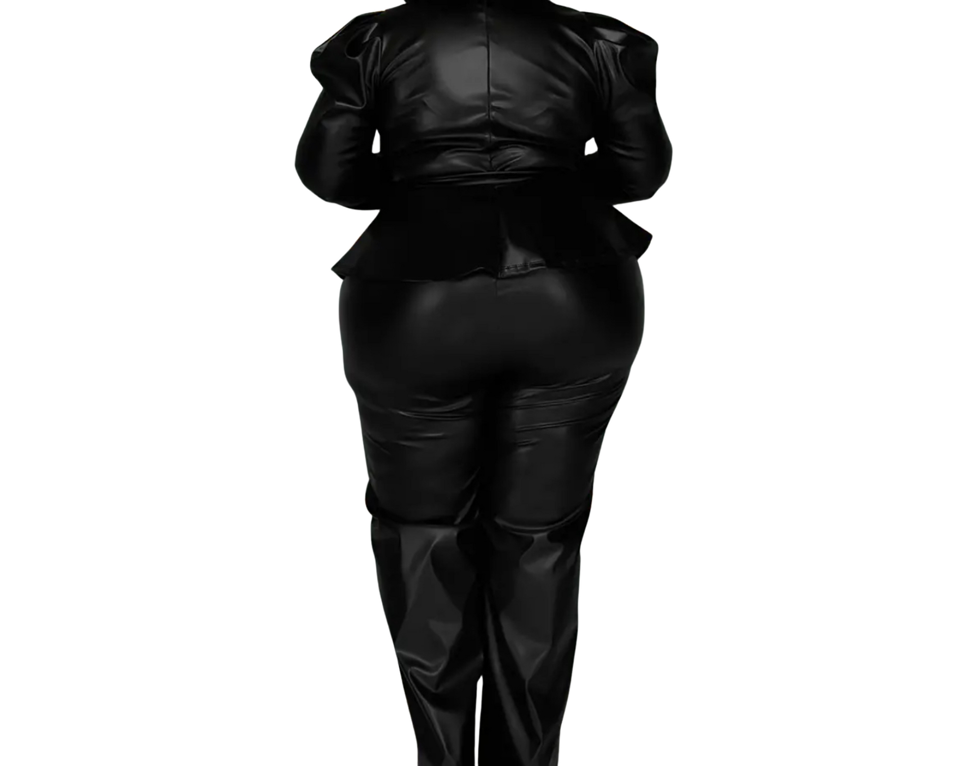 Two piece faux leather pants set. Long sleeve top with belt that can be worn with the belt to cinch the waist or without for a more relaxed look.Pants have an elastic waist with a fit and flare style.